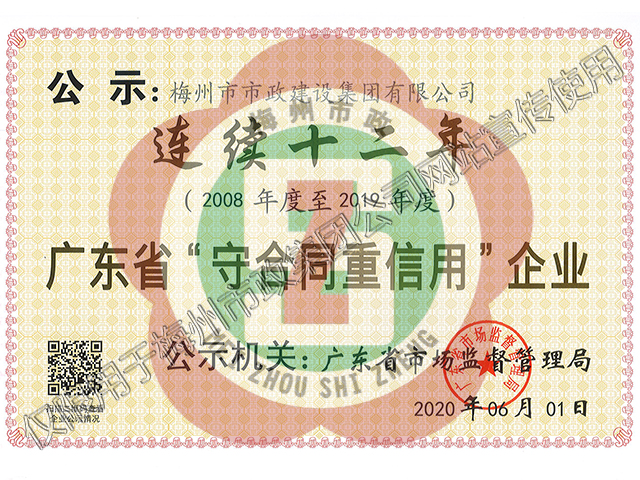 2020年6月1日,集團公司連續(xù)十二年被廣東省市場監(jiān)督管理局評為廣東省“守合同重信用”企業(yè)。
