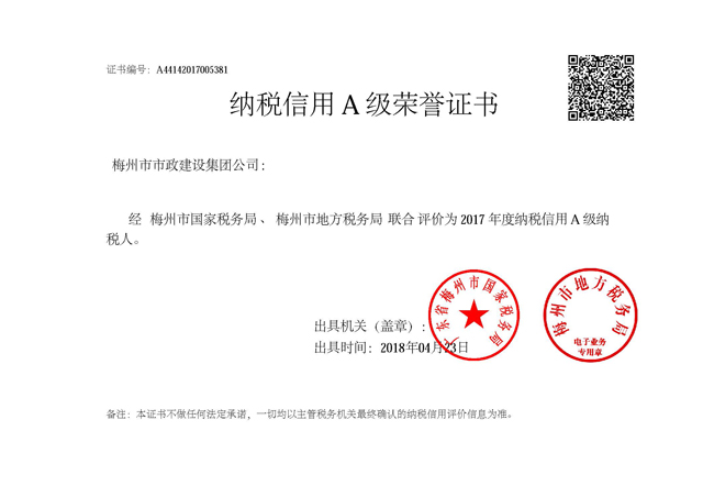 2018年4月23日,梅州市國(guó)家稅務(wù)局直屬稅務(wù)分局公告2017年度A級(jí)納稅人名單,集團(tuán)公司喜獲此稱號(hào)。