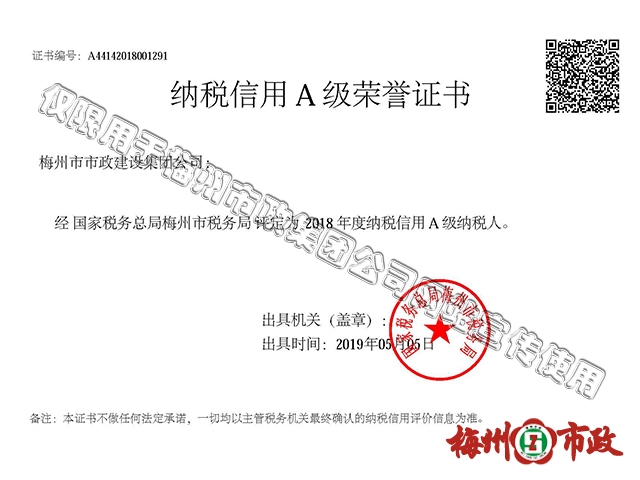 2019年5月5日,集團(tuán)公司被國家稅務(wù)總局梅州市稅務(wù)局評(píng)為“2018年度納稅信用A級(jí)納稅人”。